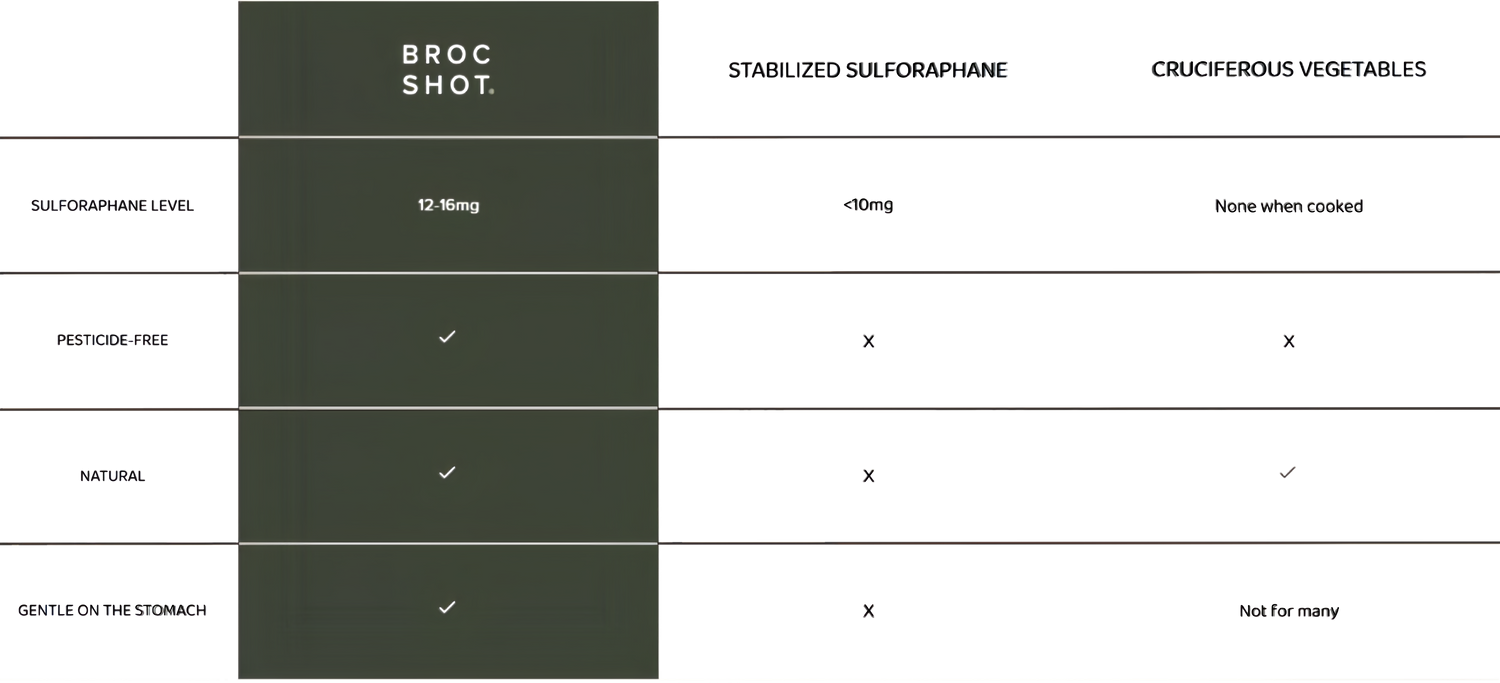 Not all sulforaphane supplements are created equal. Broc Shot was born out of the need for a reliable, sulforaphane source. We are different and you will feel the difference.