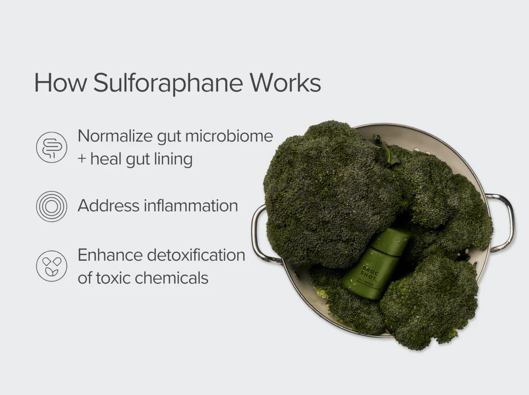 Sulforaphane is a sulfur-rich phytochemical found in cruciferous vegetables with the highest levels derived from broccoli plants. Sulforaphane has over 1,000 peer reviewed studies and articles demonstrating its ability to repair and nurture our gut, detoxify the body and reduce and prevent inflammation.